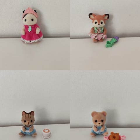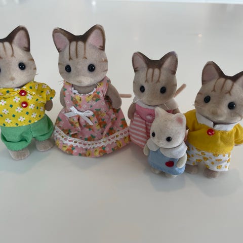 Sylvanian families figurer med noen tilbehør.