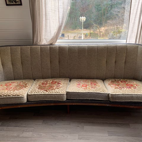 Sofaen har noen bruksmerker i skinnet, men det kan fort forbedres med lærfett.