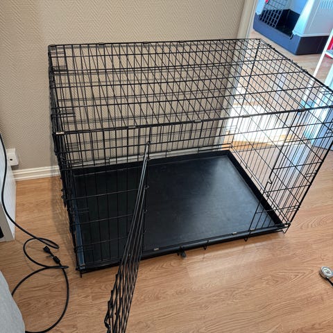 Hundebur i metall i svart farge. Buret har gittervegger og -tak, samt bunnbrett som kan tas ut for enklere rengjøring. Egnet som oppholds- eller soveplass for hund, og kan brukes hjemme, i bil eller på reise, avhengig av størrelse og behov. (Pris kan diskuteres)