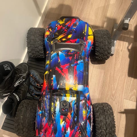 Selger en stor Traxxas T-Maxx 3.3-pakke bestående av 2 biler og mye ekstrautstyr. Her får du mye for pengene: biler, karosseri, hjul, støtdempere, reservedeler, smådeler og fuel.