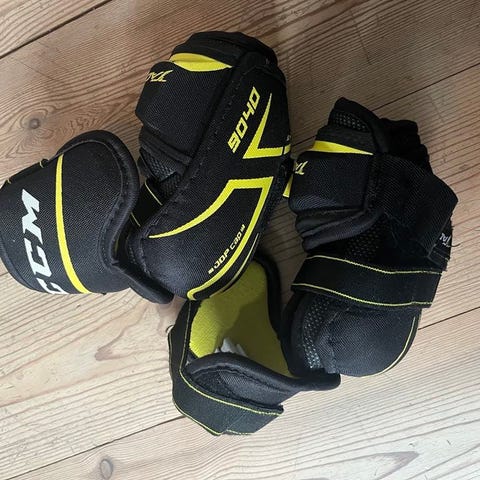 CCM og Bauer ishockeybeskyttelse som består av skulderbeskytter, hockeybukse og albuebeskyttere. Skulderbeskytteren fra CCM har polstrede skuldre og brystparti med justerbare stropper. Hockeybuksen fra CCM har god polstring rundt hofter, lår og korsrygg samt belte og feste for god passform. Albuebeskytterne fra Bauer har hardt skall over albuen, myk polstring rundt og brede borrelåsstropper for å holde beskytteren på plass. Utstyret er egnet til bruk på is under ishockeytrening og kamp, og gir beskyttelse av overkropp, hofter og albuer.