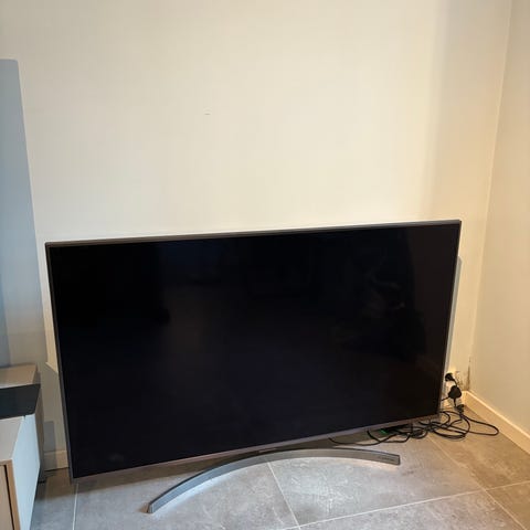 LG TV. Flat skjerm-TV med tynn ramme og buet bordstativ. Viser smart-TV-grensesnitt med tilgang til ulike strømmetjenester via internett. Egnet for bruk i stue eller andre oppholdsrom. Veggfeste (kan svinges ut) følger med, som gir mulighet for montering på vegg i stedet for bruk av bordstativ.