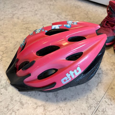 Sykkelhjelm rosa og hvit med svart skjerm