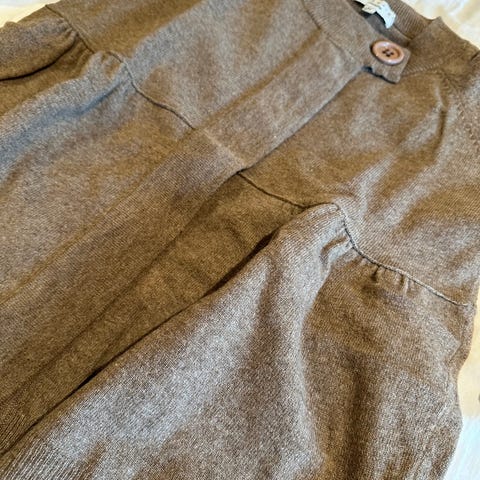 Noa Noa cardigan i nydelig blågrå farge i størrelse M. Lang modell med rund hals og ribbestrikkede kanter. Den er laget av 60 % viskose, 15 % bomull, 15 % polyamid, 5 % ull og 5 % angora. Lukkes med knapper foran og har lange ermer med lett puffeffekt. Veldig fin. Det er 3 flekker bak på den ene armen. Jeg har ikke forsøkt sitronsåpe på flekkene. Ellers ingen skader.