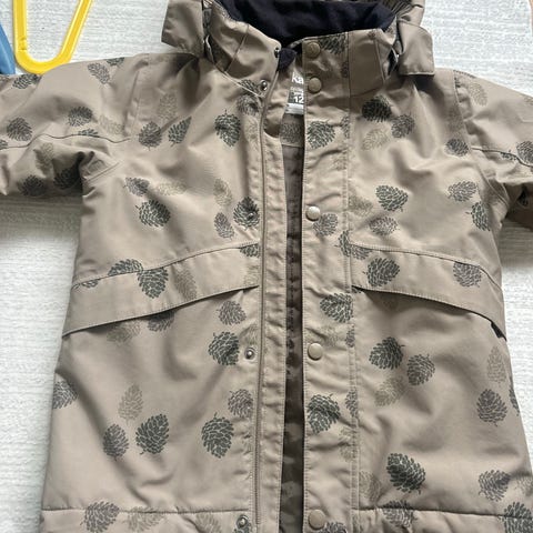 Jakken har avtakbar hette med trykknapper, glidelås i front og to glidelåslommer. Det er refleksdetaljer på ermer og nederkant for bedre synlighet. Innsiden har nettingfôr øverst og glatt fôr nederst. Egnet som ytterjakke til hverdagsbruk og utendørs lek.