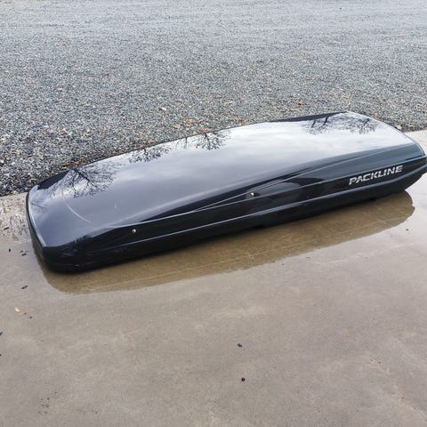 Selger en solid og romslig takboks fra Packline. Boksen er brukt og har blitt matt i lakken av sol og vær, men den er hel, robust og fungerer akkurat som den skal. Dette er en solid glassfiberboks som tåler mye.