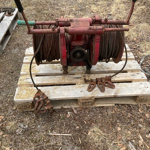 Manuell vinsj med tau montert på trestativ. Vinsjen har tannhjul i metall og sveiv for manuell betjening. Tauet er viklet på trommel i metall, og stativet er bygget i kraftige trelekter med metallfester. Egnet til trekking og løfting der det er behov for manuell vinsj, for eksempel på gårdsplass, ved hytte eller i andre utendørsmiljøer der det er praktisk med fastmontert vinsj på underlag.