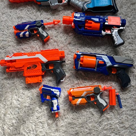 Nerf leker våpensett. Bildet viser et utvalg Nerf-blastere og tilbehør i ulike størrelser og modeller. Settet består blant annet av flere plastblastere, magasiner og løse deler som kan brukes sammen. Passer til lek med skumprosjektiler innendørs eller utendørs, avhengig av alderstilråding fra produsent på de enkelte produktene. Alle deler er i typiske Nerf-farger med kombinasjoner av oransje, grått, blått og hvitt plastmateriale.
