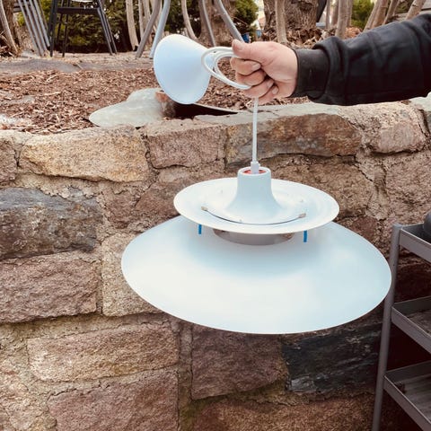 Lampen har fått nytt elektrisk. Den har også fått en ny takkopp med wagor koblinger som gjør at den er lett å koble fra taket og videre til strøm.