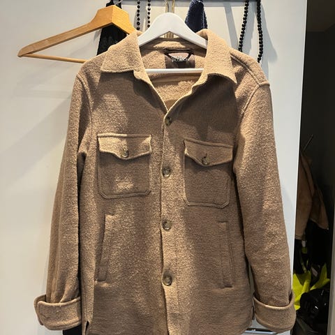 Izaac jakke for herre i størrelse XL. Jakken er beige og laget i fleece-materiale. Den har krage, knappelukking i front og to brystlommer med klaff. Innsiden har mønstret fôr. Passer som ytterjakke eller lett overgangsjakke.