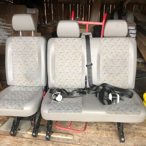 Bilseter med armlener i grått tekstiltrekk. Setet har integrert hodestøtte på noen av variantene og justerbare armlener på begge sider. Passer som erstatningssete eller ekstrasete i bil eller varebil der festepunkter og skinner er kompatible. Tekstiltrekket har mønster i flere farger på enkelte av setene, og ensfarget grått trekk på et av setene. Egnet for montering i kjøretøy som bruker denne typen seteunderstell og beltefester.