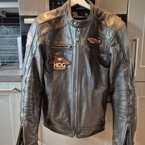 Sjelden Harley-Davidson Racing skinnjakke i svart med oransje og hvite detaljer, størrelse L. Jakken er laget i skinn med mesh-fôr på innsiden. Store Harley-Davidson-logoer foran, bak og på ermene. Kort modell. Flere lommer med glidelås og polstrede partier på skuldre og ermer.