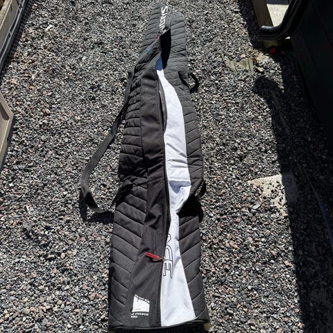 Dakine skitrekk med hjul i svart rutemønster. Trekket er polstret og har glidelåsåpning langs siden for enkel tilgang til skiutstyr. Utstyrt med to kraftige hjul og håndtak for trilling. Egnet for transport og oppbevaring av ski og staver. Det er synlig slitasje og rifter i stoffet i den ene enden, som bør tas i betraktning ved bruk.