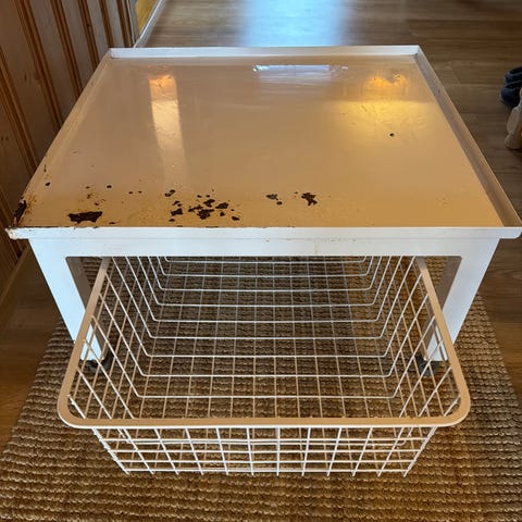 Hylle / stativ i metall med skuffe til å sette vaskemaskin og/eller tørketrommel på. Gjør det enkelt å holde det rent under maskinen! Pent brukt