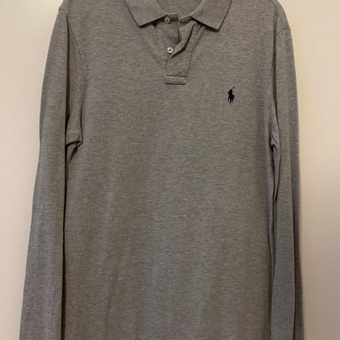 Ralph Lauren langermet piquegenser for herre i størrelse M. Genseren er beige og laget i bomull. Klassisk polosnitt med krage og knappestolpe, samt brodert logo på brystet. Passer til hverdagsbruk og kan kombineres med både jeans og chinos.