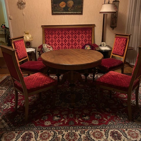 Antikk salonggruppe med sofa, bord og to lenestoler med rødt trekk