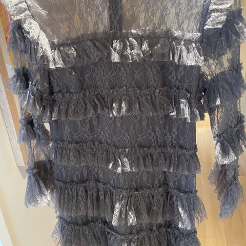 Love Lolita festkjole for dame i størrelse M. Kjolen er svart og laget i polyester. Modellen har gjennomsiktige ermer og overdel i tyll med små prikkedetaljer, volanger over bysten og langs ermene, samt volangkant nederst på skjørtet. Lukkes i nakken med glidelås og knapp og har markert midje. Egner seg som penkjole til fest og andre anledninger.