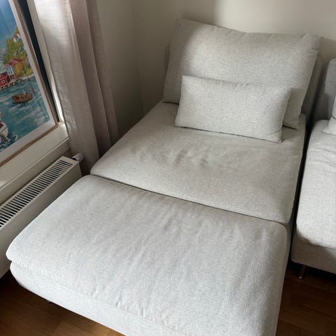 Selges samlet 2000kr eller 1 for 1500kr. Pent brukt, men litt nuppete. Avtagbart trekk som kan vaskes i vaskemaskinen, kunne trengt en vask. Selges uten de store putene, følger med 4 små puter som vist på bilder. Må hentes i gamlebyen Oslo, heis tilgjengelig.