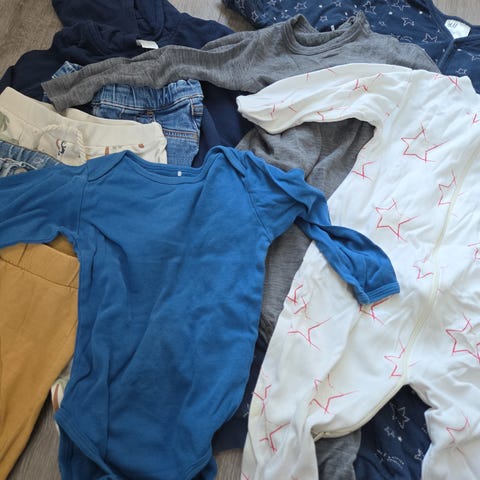 En stor pakke med babyklær i str 68 og 74. Mesteparten er brukt når sønnen vår var 4 til 6 mnd, noen til rundt 8 mnd. Fra røykfri og dyrefri hjem. Ingen flekker eller hull. Kan sendes og kan også selge separat. Alt samlet 950kr
