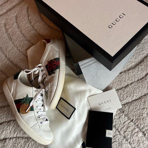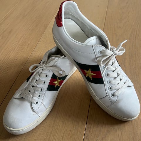 Gucci sneakers i hvitt skinn i størrelse 37. Skoene har klassiske grønne og røde striper på sidene og grønn detalj med preget Gucci-logo på hælen. Overdelen er laget i strukturert skinn med snøring foran. Yttersålen er i gummi med mønster og Gucci-logo under. Modellen passer som fritidssko til hverdagsbruk.