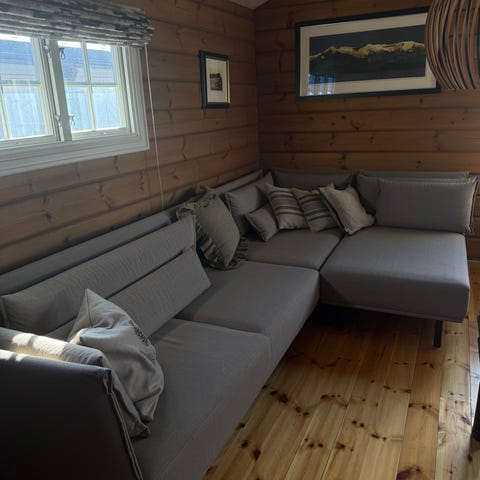 Sjeslongdelen har en liten slitasje; polstringen buler litt ut på den ene siden (se bilde nr. 3). Dette har ingen betydelse for funksjon. Foruten dette har sofaen ingen bruksmerker, og har stått i et røyk- og dyrefritt hjem.