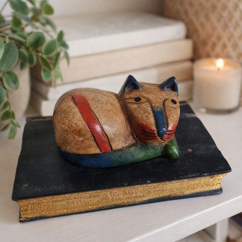Dekorative vintage treskulpturer formet som katter. Figurenes overflate er malt med stripete og flerfargede mønstre i blant annet svart, hvitt, oransje, grønt og rosa. Skulpturene har ulike høyder og uttrykk, fra høy stående katt til mindre figurer. Egner seg som innredningsdetaljer i stue, gang eller andre rom der man ønsker et særpreget og fargerikt innslag. Laget i tre med malt overflate.