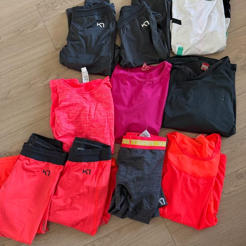 Rydder i skapet før flytting🌸 Klespakke med treningsklær/turklær, samt et par sko! Skoene er kun brukt inne. Klærne er strl xs-s. Klær fra blant annet gymshark, famme, peach, adidas, kari traa!