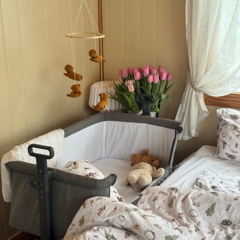 Tova bedside crib lar babyen sove trygt helt inntil deg, slik at nattamming og trøst går enklere. Sengen trilles på plass ved siden av foreldresengen, festes med medfølgende bånd og kan justeres i fem nivåer for god tilpasning. Den nedfellbare langsiden gir nærhet uten løfting over kant, og de luftige mesh-panelene gir både innsyn og god ventilasjon. Når dere skal bort eller vil rydde den bort, foldes den raskt sammen og legges i transportbagen.