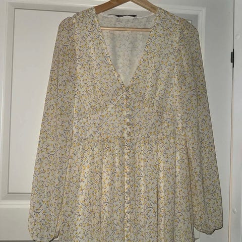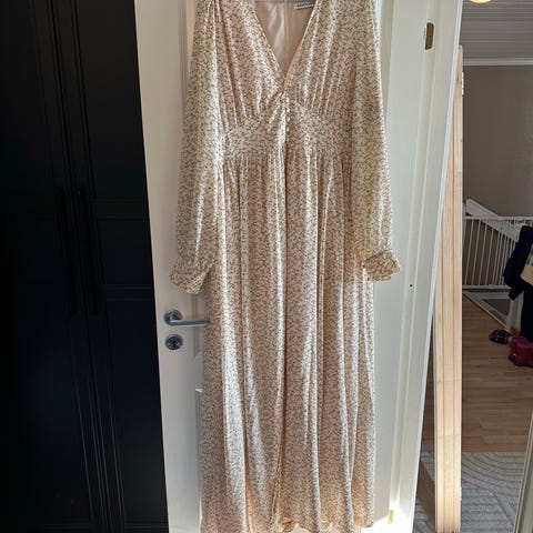 Som ny, kun brukt en gang. Dus rosafarge. Den har dyp V-utringning, lange ermer med lett puff og knapperekke foran. Lengden går omtrent til leggen. Selges for 350kr