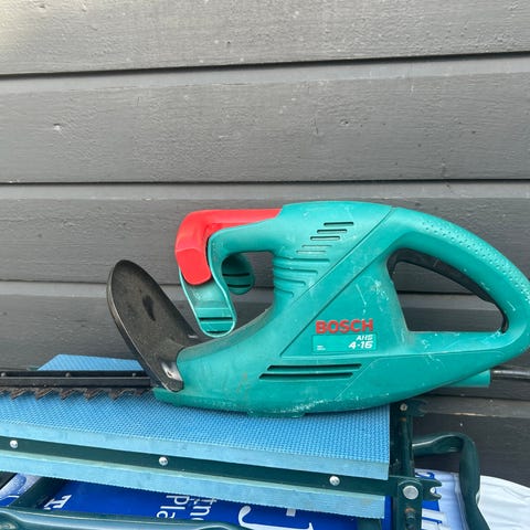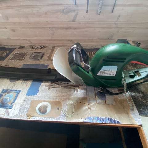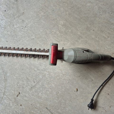Elektrisk hekksaks med ledning. Hekksaksen har tohåndsgrep og lang sverdlengde egnet for klipping og forming av hekk og busker i hage. Leveres med strømkabel som vist på bildene. Fargekombinasjon grønn og rød plast i håndtak og hus. Egner seg til vanlig vedlikehold av hekk og mindre greiner i hagen.