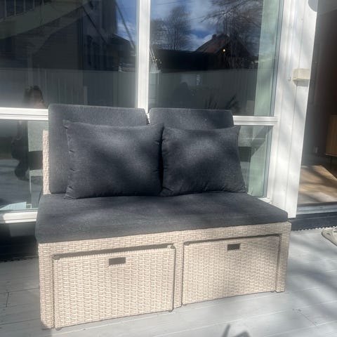 Møblene er egnet til bruk på terrasse, balkong eller i hage som sittegruppe med oppbevaringsmulighet. Beskrivelse er basert på visuelle observasjoner fra bildene.