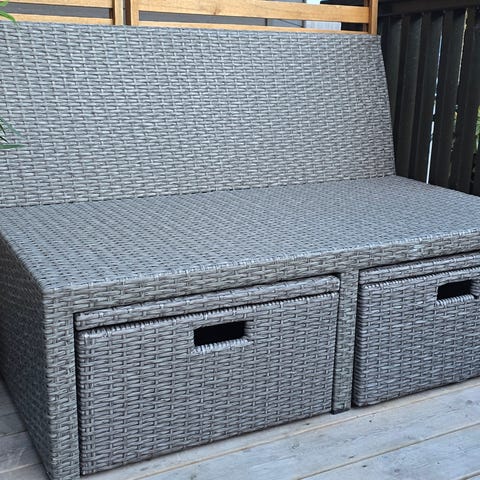 Sofaen har ryggstøtte og sitteflate i flettet grå rotting. Under sitteflaten er det to separate oppbevaringsbokser/skuffer som kan trekkes ut. Hver boks har lokk som kan åpnes oppover og innvendig rom for lagring av puter eller annet utstyr til uteplassen.