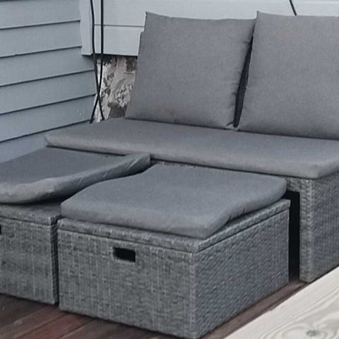 Utemøbelsett bestående av en liten sofa med oppbevaring og et rektangulært bord i grå kunstrotting.