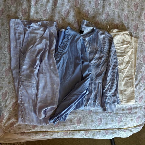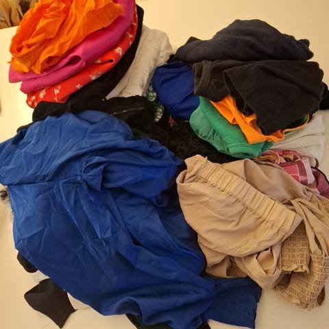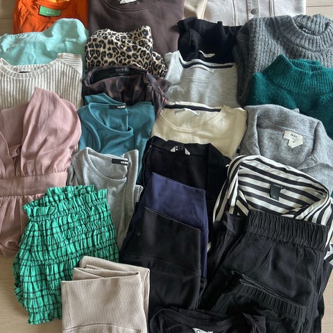 Stor blanding med sommerklær/vårklær fra blant annet Levete Room, YAS, VILA, Gina Tricot, Nelly, Minus, Weekday og Only: topp er, bukser, kjole og skjørt i ulike farger og mønstre. Fine plagg med vanlig brukte preg, men mye klær igjen. Mange av plaggene må nok strykes da de er oppbevart i en pose i boden. Alle plagg er i str XS/S