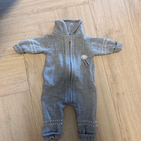 Lillelam ulldress i størrelse 74 for unisex. Dressen er i grå ull med hel glidelås foran og krage. Den har lange ermer og ben, samt dekorativt dyremotiv på siden. Strikket struktur øverst på bryst og rygg. Egnet som heldress til baby/barn i kjøligere vær.