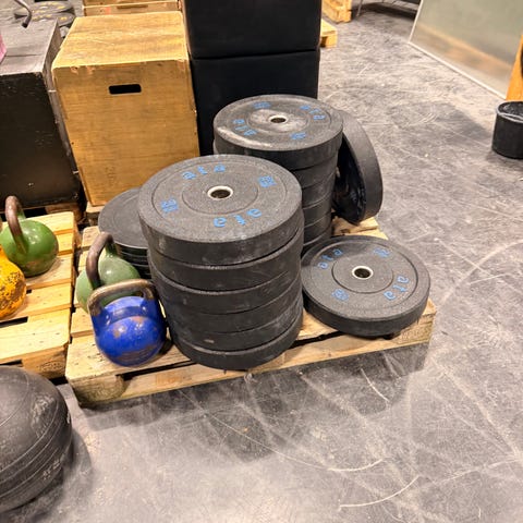 Vektstang med tilhørende vektskiver i metall. Settet består av en lang stang og flere skiver i ulike vektklasser, både større og mindre plater. Skivene har standard hull for montering på stangen, og det følger med fjærklemmer/låser for å holde skivene på plass under bruk. Egnet til styrketrening som markløft, knebøy, benkpress og annen generell styrketrening hjemme eller på treningsrom. Nøyaktig totalvekt og enkeltvekter på skivene er ikke spesifisert og bør kontrolleres ved behov.