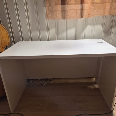 Skrivebordet har rektangulær bordplate og rette ben, egnet som arbeids- eller studiebord. Overflaten er mørk og glatt, og bordet har plass til PC, skjerm og skriveutstyr.