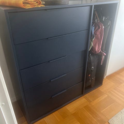 Praktisk kommode i brunn farge gis bort mot henting. Den er godt brukt med noen bruksmerker, og én skuff må fikses, men fungerer fint ellers og kan få et nytt liv hos noen handy.