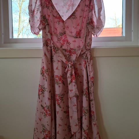 Cubus sommerkjole for dame i størrelse 52 Kjolen er flerfarget med blomstermønster og laget i bomull. Modellen har knytebelte i livet og kortere ermer. Passer som sommerkjole til hverdagsbruk eller enkle anledninger.