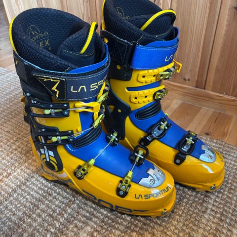 La Sportiva Spitfire skistøvler. Superlette! Kun brukt et par ganger og er dessverre for trange til meg. Støvlene har størrelse UK 9,5 / EU ca. 42. Modellen har flere justerbare spenner foran, power strap øverst og EZ Flex-innersko for bedre bevegelse i skaftet. Bak på støvelen er det gå-/kjøremekanisme og lett, gjennombrutt skaftkonstruksjon. Passer til topptur og frikjøring der man ønsker en lett og teknisk skistøvel med godt hælgrep og presis passform.