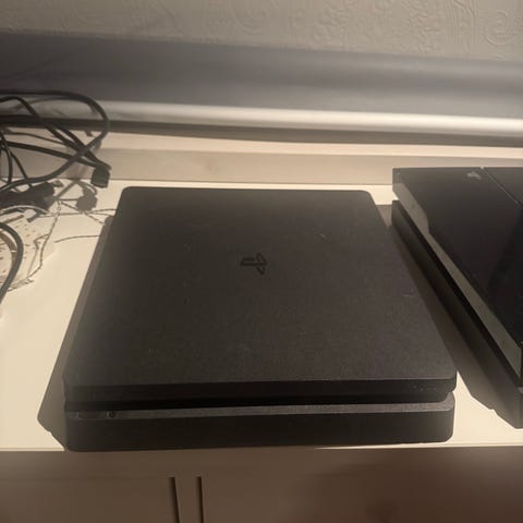 Sony Playstation 4 spillkonsoll 500 GB i svart. Standard PS4-modell med tilhørende svart DualShock 4-kontroller, egnet for bruk med TV eller skjerm som støtter HDMI-inngang. Konsollen kan brukes til Playstation 4-spill, avspilling av film og musikk, samt ulike strømmetjenester, avhengig av hvilke funksjoner som støttes av systemprogramvaren og tilkoblede tjenester.