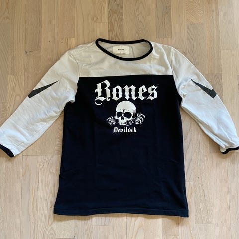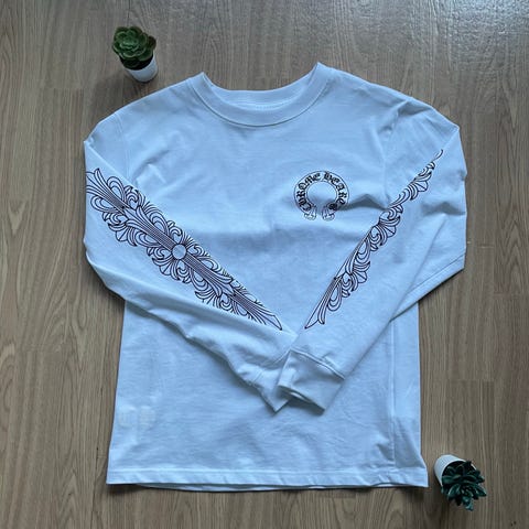 Chrome Hearts langermet t-skjorte for herre i størrelse M. Plagget har hvit front og rygg med svarte ermer og kontrastfarget ribb i halsen med Chrome Hearts-logo. Stor hestesko-logo er trykket både på brystet og på baksiden, samt logotrykk langs ermene. T-skjorten passer til hverdagsbruk og kan kombineres med jeans, joggebukse eller shorts for et avslappet uttrykk.