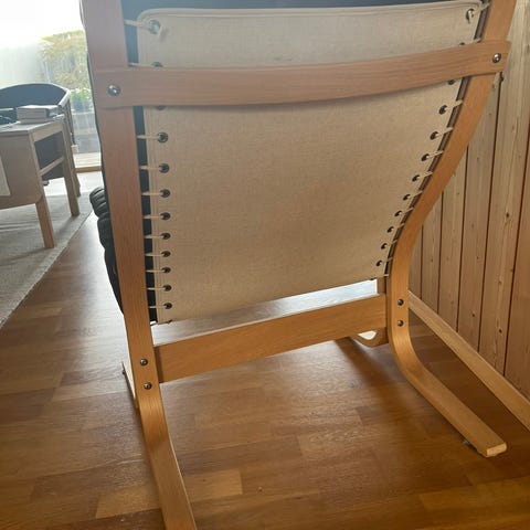 Bruno Mathsson lenestol i tre med svart hodepute.