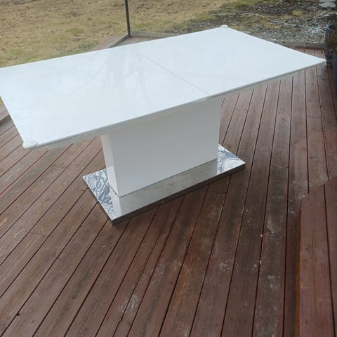 Et velholdt, blankt hvitt bord med sølvfarget understell på begge sider.
