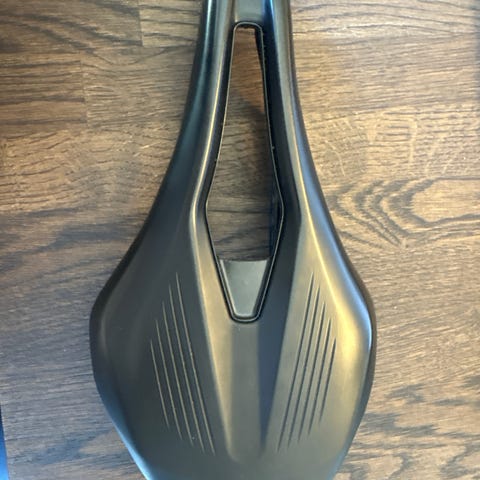 Setet har skall og rails i karbon (merket «braided» på undersiden), noe som gir lav vekt og høy stivhet. Oversiden er glatt og smal, typisk utforming for landeveissykling eller konkurransebruk.