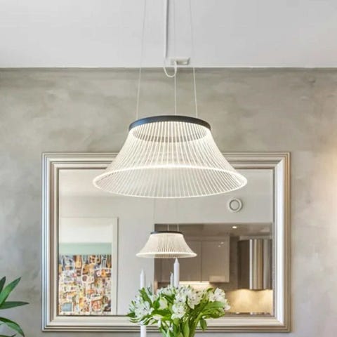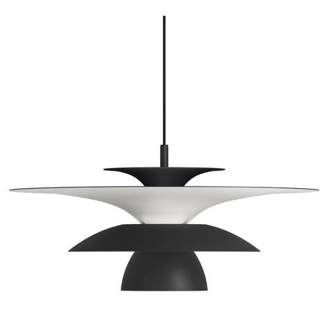 Diablo er en eksklusiv familie med pendel, gulv-, bord- og vegglampe i klassisk design. Pendelen er tenkt som et lyssmykke, der de indre detaljrike skjermene omsluttes av lys. Passer i stue og kjøkken. Lyspære er inkludert. Sokkel G9. 10 watt. Dimbar. IP20. Hvit tekstilkledd ledning, lengde 2,8 m. Takkopp medfølger, montering i tak. Høyde 12 cm og diameter 30 cm. Klasse II. Designer Joakim Fihn. Produsert i Varberg, Sverige.