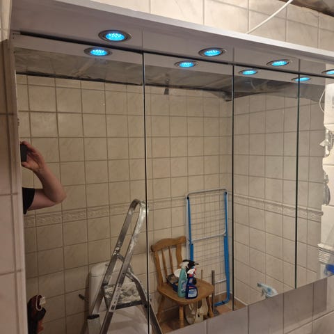 Demontert. Klart til henting. Dobbel vask, 2 stk Grohe blandebatterier, lyslist, speilskap, bredde 150cm. Vasken er en del flekker som ikke går vekk, men ellers helt fin stand! Servsntbatteriene gode som nye. Skapene er fra 2010, og er synlig og godt brukt, men i fin stand. Glasshyller i 2 etg i alle speilskap. 1 hylle i underskapene.