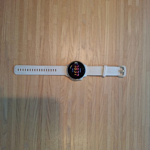 Smartklokke med rundt urkasse og hvit silikonreim. Klokken har flere justeringshull i reimen for tilpasning til håndleddet. Baksiden har ladekontakter og sensorer for måling mot huden. Egnet til daglig bruk og aktivitetssporing