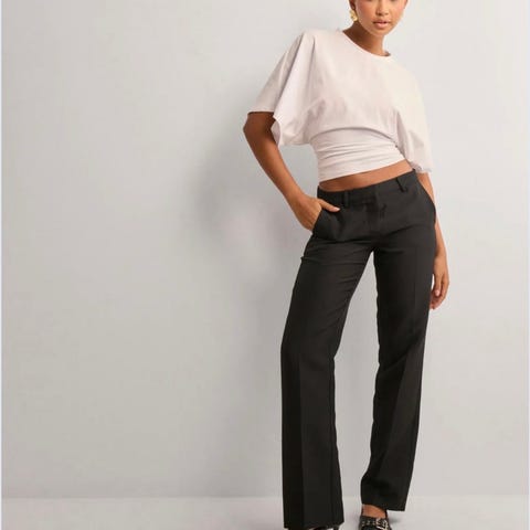 «Asymmetrisk one shoulder-topp med tilpasset midje. Toppen er svart og har båtutringning. Den har korte ermer, utringede skuldre, kort lengde og vanlig passform.»