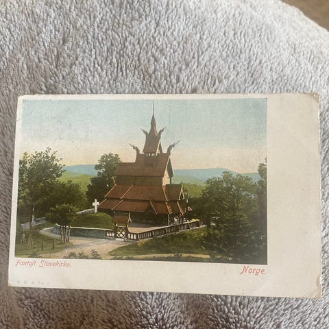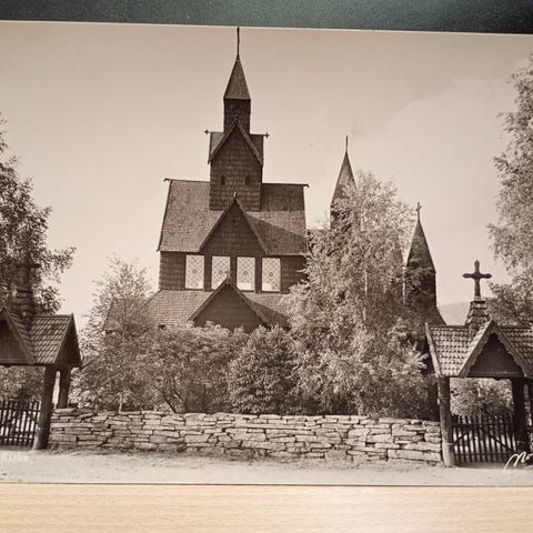 Flott eldre postkort med motiv av de kjente Søsterkirkene på Gran på Hadeland – et av Norges mest særpregede middelaldermotiver.